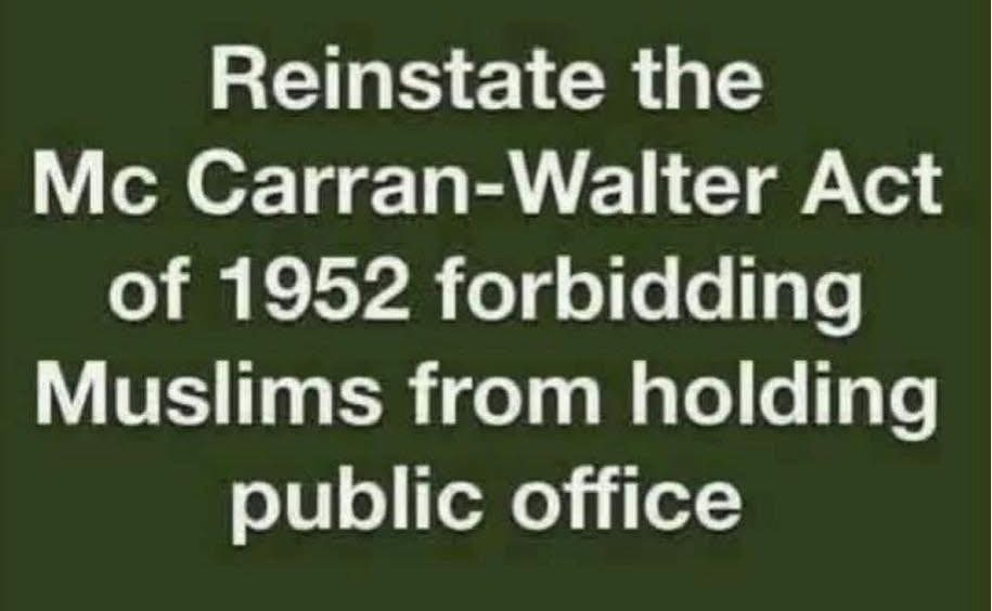 Even worse, the McCarran Walter Act of 1952 did not, near as I can tell, have anything to do with restricting Muslims from holding political office. In fact, it had nothing to do with elections at all. It was about immigration quotas.